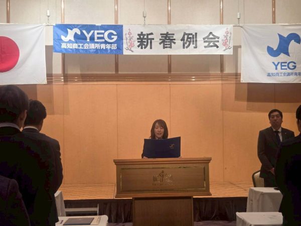 本例会には、高知商工会議所 会頭 西山彰一様、副会頭 山崎道生様をお招きし、ご来賓の皆様とともに新年の門出を祝いました。ご講話では、商工業を取り巻く環境や経済の見通し、そして青年部への期待など、今後の活動に示唆を与える貴重なお話をいただきました。