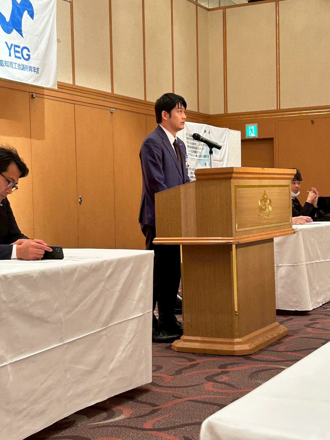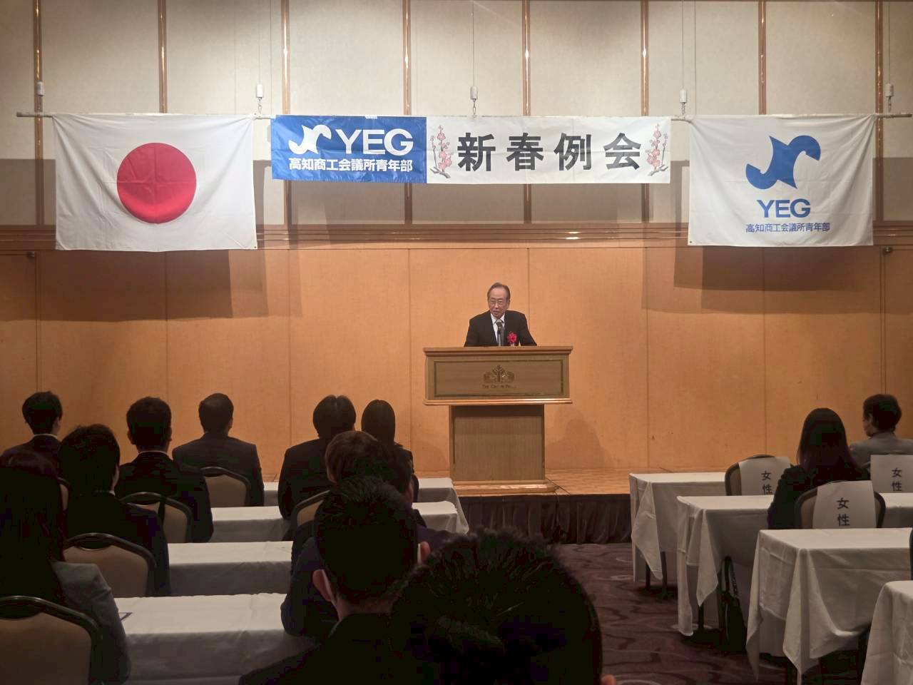 本例会には、高知商工会議所 会頭 西山彰一様、副会頭 山崎道生様をお招きし、ご来賓の皆様とともに新年の門出を祝いました。ご講話では、商工業を取り巻く環境や経済の見通し、そして青年部への期待など、今後の活動に示唆を与える貴重なお話をいただきました。