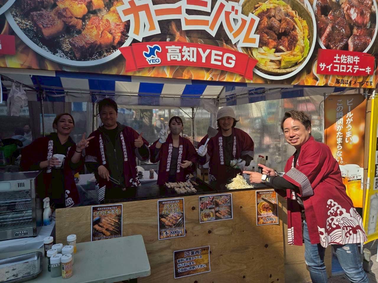 今回は「肉カーニバル」と題し、土佐和牛のサイコロステーキ、サイコロステーキ丼、カルビ串、四万十豚串など、高知が誇るお肉の魅力を来場者の皆さまに楽しんでいただきました。会場では多くの方にお立ち寄りいただき、大変賑わいのあるブースとなりました。